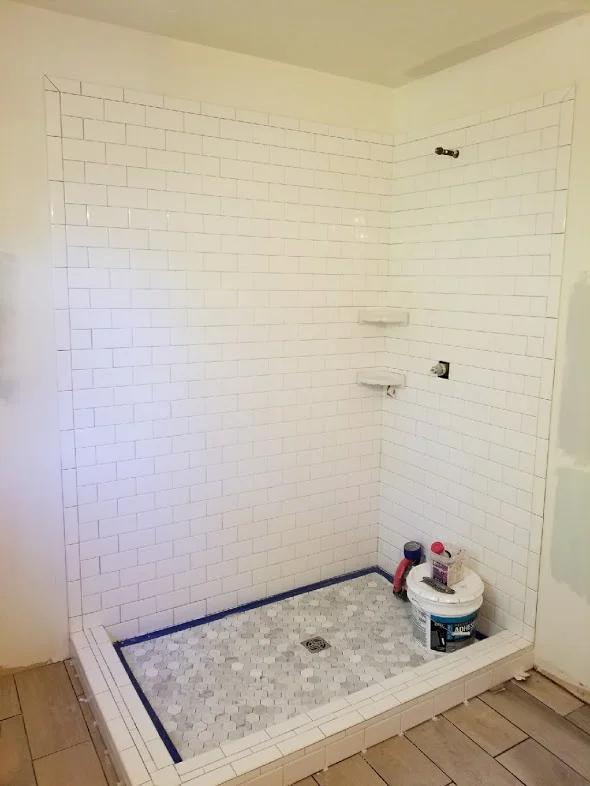 We went with Subway tile and Charcoal Grout for our shower walls mimicking the design in the kitchen; and for the shower floor went with a hexagon shape with some texture and grip. We wanted our floor tile to look as cohesive as possible to the rest of our flooring, and we were able to find almost a perfect match wood look tile at Home Depot.