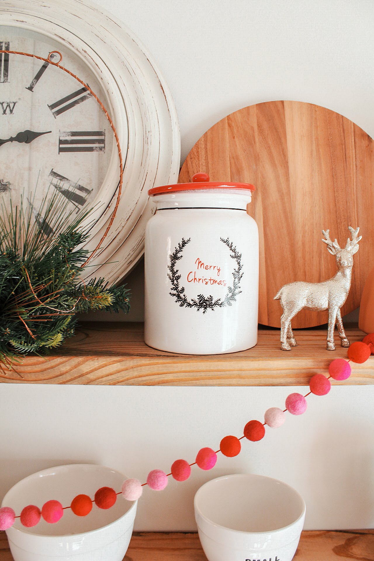 Something about felt garland makes my heart so happy. I picked up this pink and red one from World Market and it goes great with the Burgundy and rosy colored trees. I bought this “half of a wreath” as Bobby calls it from Target and after walking around the entire house 3 times with it, I plopped it here and all felt right. We bought the letters to Santa box from the Hearth and Hand line last year and couldn’t wait to pull it out again (it’s available this year too!) And lastly, probably the most traditional of my current decor but you just have it have it: a good Christmas cookie jar. We have a secret family Christmas cookie recipe that get’s a lot of requests this time of year and I basically turn into a cookie making machine Thanksgiving - New Years. It’s one of my most distinct memories from my childhood holidays so there’s something very sentimental in my heart for them.