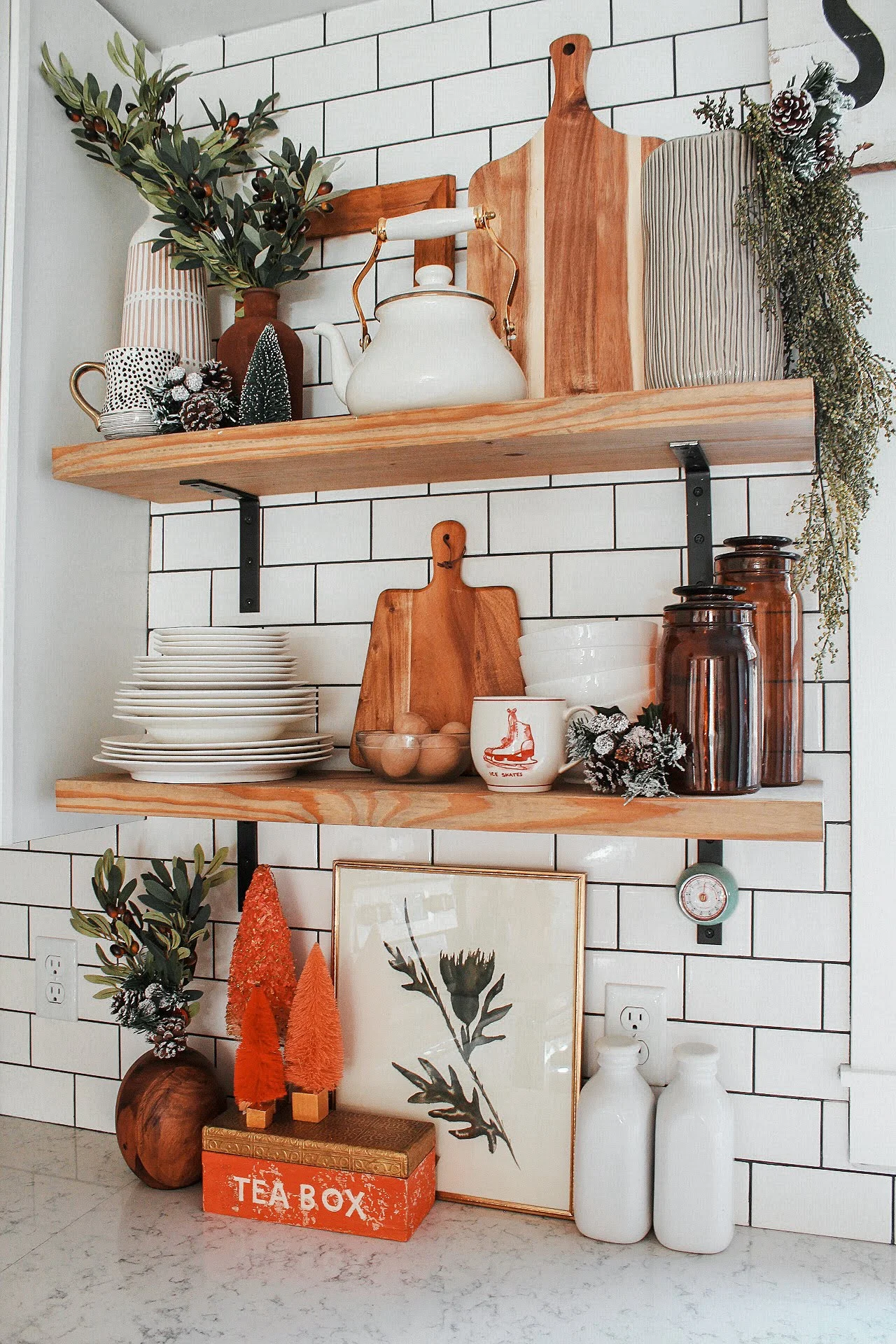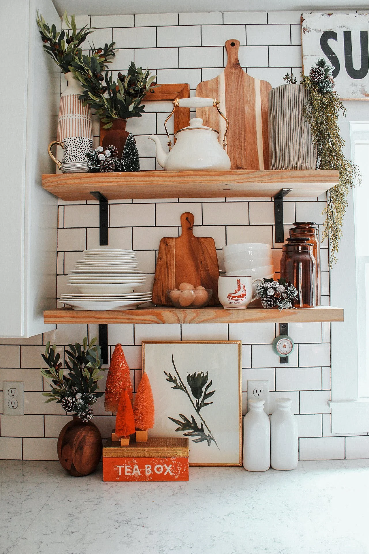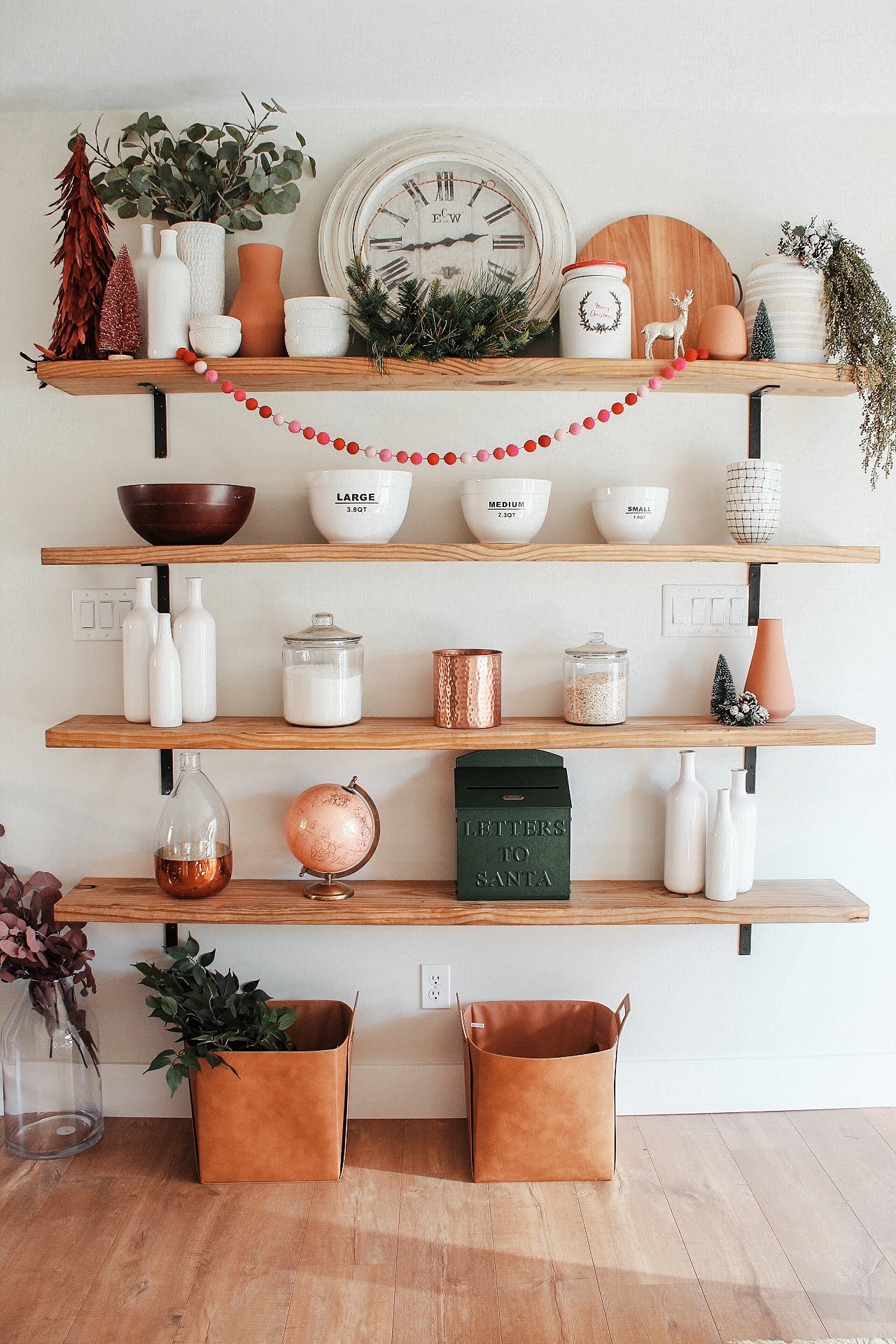 I like to incorporate the entire house this time of year. I spend so much time in the kitchen, even more so this time of year and I want to enjoy the feeling of Christmas as much as possible. We kept it simple by updating the shelves with small details and adding in wreaths .