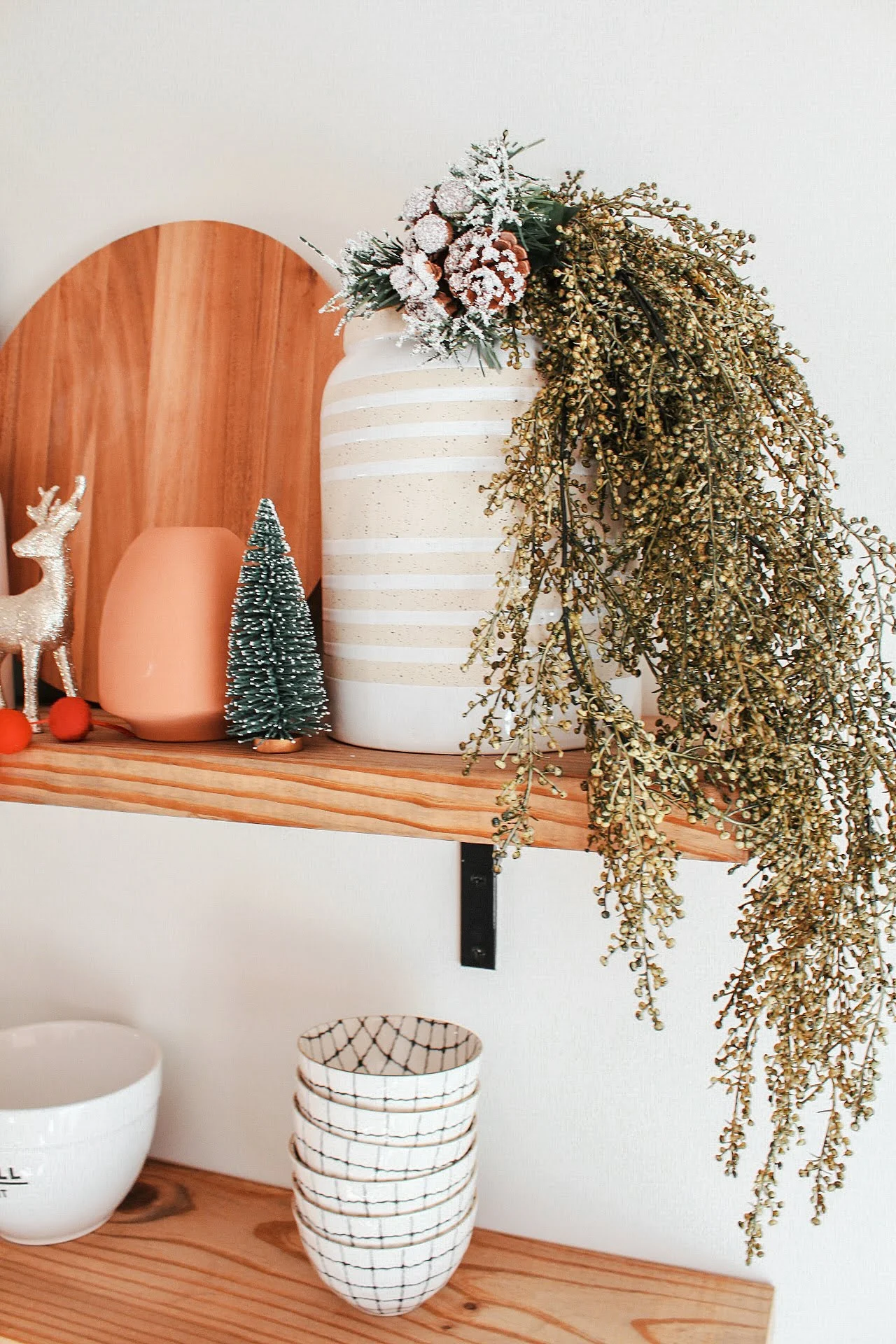 A cute Christmas mug, adding snowy pieces into our existing greenery, a few bottle brushed trees was really all it took. Our DIY range hood didn’t make the by Christmas to do list, so we just opted for a wreath above the microwave.