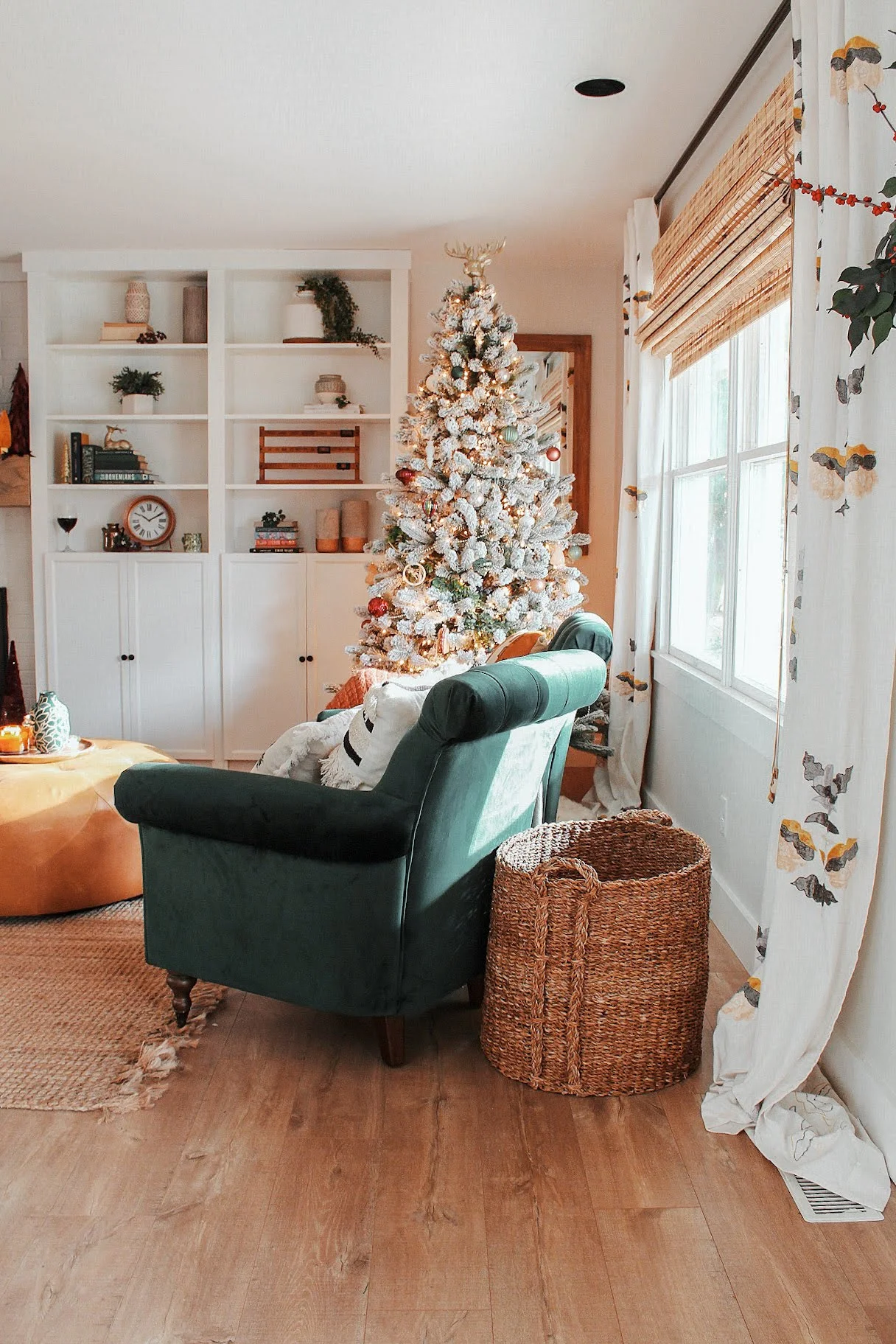 We won’t discuss how I already had our dark green tree in here done and decorated but decided to take it down and start over because “something didn’t feel quite right”… yup. I did. And it was so worth it. This one looks so much better against our green chairs and curtains and fits the space so effortlessly. Finishing it off with a faux fur white tree skirt I dug out of storage from years ago was the icing on the cake to this “Anthro on a budget” inspired tree.