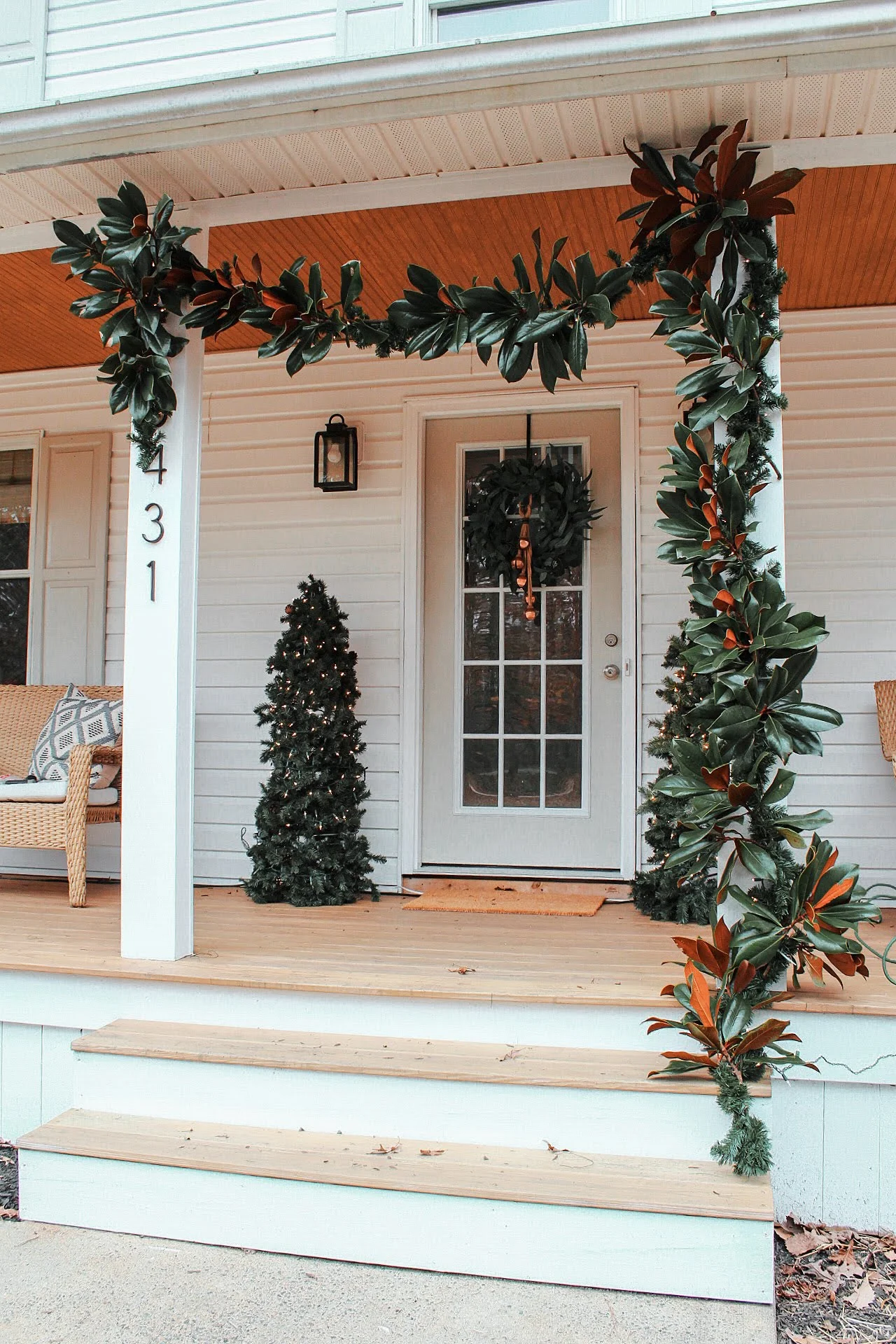 This wreath has been on our door all year, so I just added some fun copper bells to make it look in season. We framed our front stairs with our DIY Magnolia Garland and a two trees I made out of tomato cages and garland.