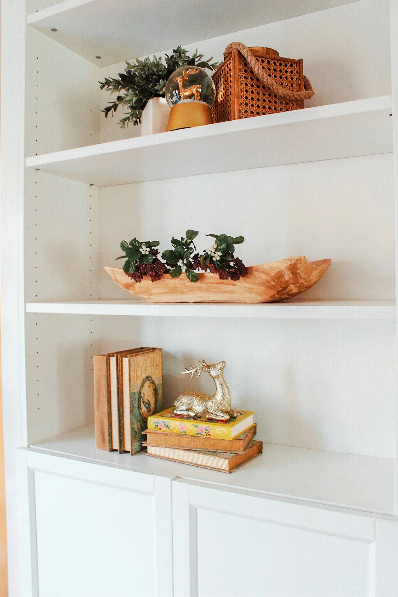 For our built ins I wanted to keep our typical decor on them, so we added in small pieces of mistletoe throughout and little pops of gold reindeer and trees. It’s just enough to add the feeling in without changing too much.