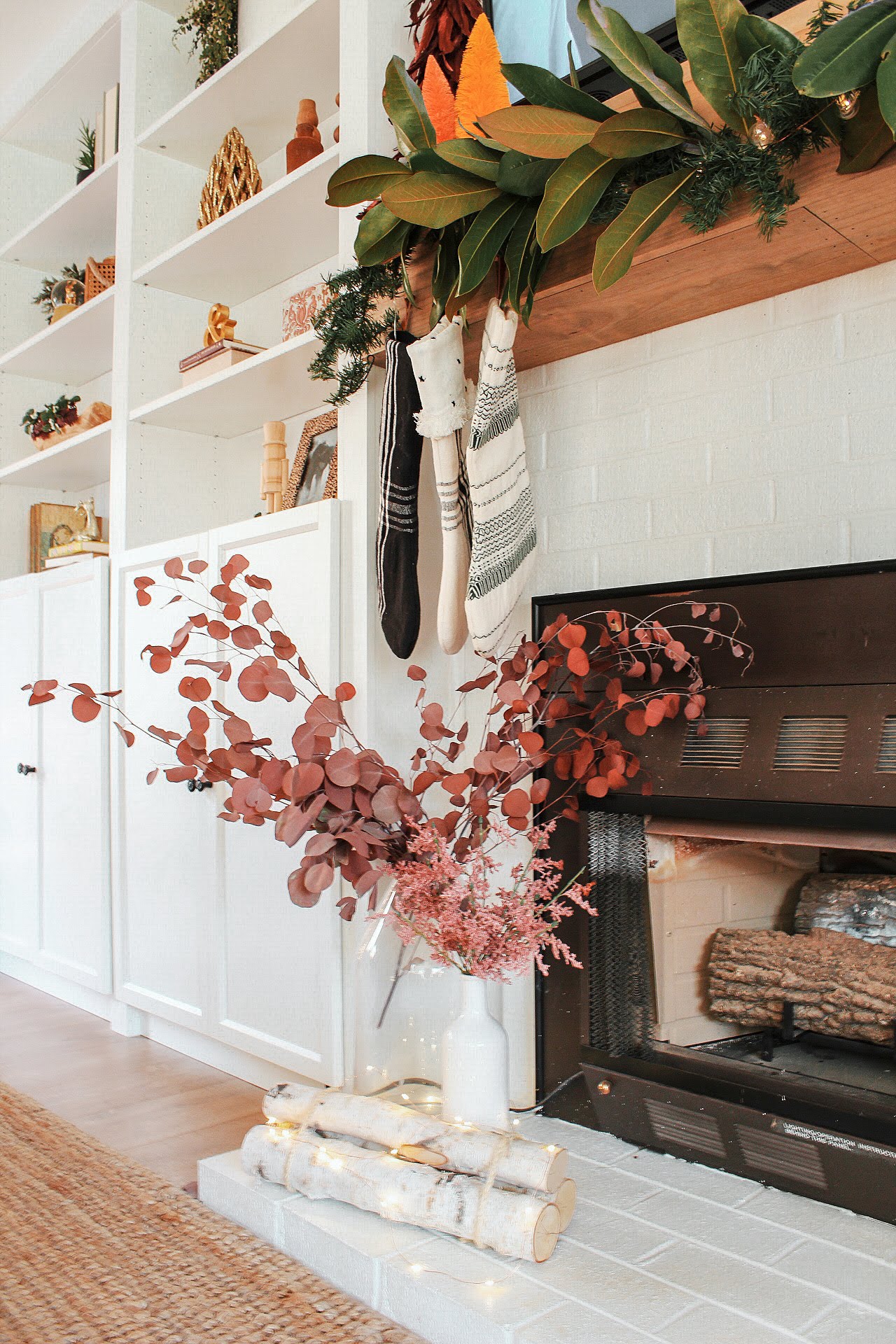 We’ve got a lot of orange and rust happening in our home as of this last year so I took a chance and decided to try and make “orange Christmas’ a thing. We found tons of bottle brush trees at Hobby Lobby for crazy low prices and these beautiful feathered burgundy ones as well. Our DIY Magnolia Garland adds a funky unique but still festive vibe to the space. I also decided to carry over our dried eucalyptus stems from fall, they transitioned well with the cranberry, burgundy and rose tones.